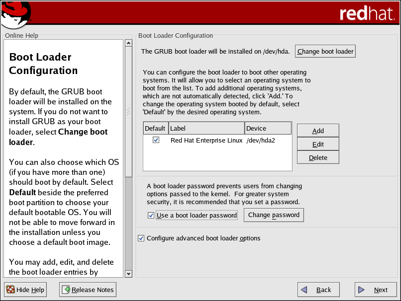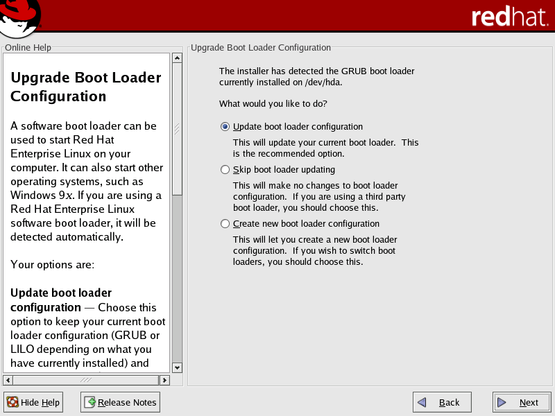 Create new boot loader configuration — Choose this option if you want to create a new boot loader for your system. If you currently have LILO and want to switch to GRUB, or if you have been using boot diskettes to boot your Red Hat Enterprise Linux system and want to use a software boot loader such as GRUB or LILO, create a new boot loader configuration (refer to Section A.3.1 Creating a New Boot Loader Configuration for more information).