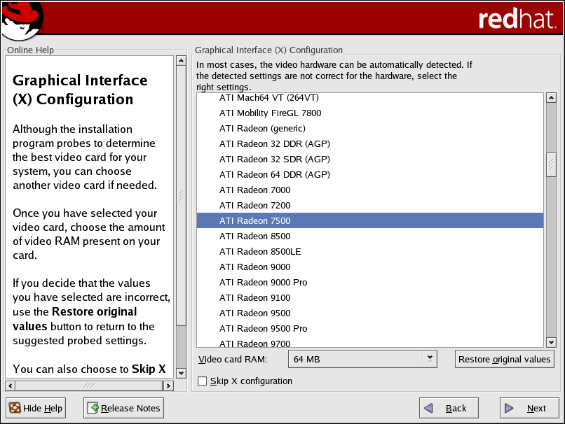 To change your X configuration after you have completed the installation, use the X Configuration Tool. Type the redhat-config-xfree86 command in a shell prompt to launch the X Configuration Tool. If you are not root, it prompts you for the root password to continue. |