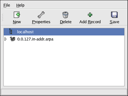 After adding, editing, or deleting a zone, click the Save button or select File => Save to write the /etc/named.conf configuration file and all the individual zone files in the /var/named/ directory. Saving changes also causes the named service to reload the configuration files. Selecting File => Quit saves the changes before quitting the application.