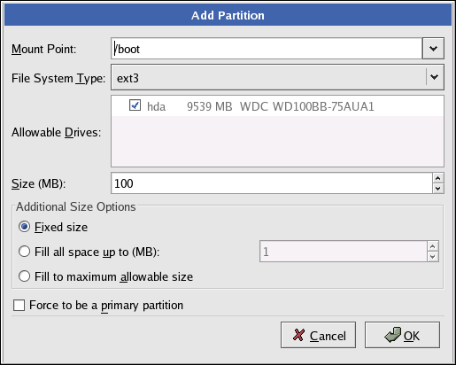 If the partition already exists on your hard disk, you can only change the partition's mount point. To make any other changes, you must delete the partition and recreate it.
