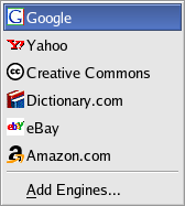 The Search field uses the most popular search engines to look for sites related to the keywords you enter. Select the search engine Firefox should use by clicking on the icon at the left of the field. Enter the keywords and press [Enter] to perform the search.