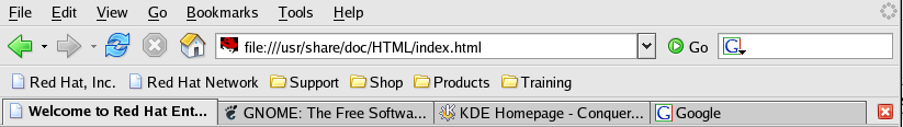 Once you have configured your Internet connection (refer to Chapter 5 Connecting to the Internet), you are ready to browse the Internet. Red Hat Enterprise Linux comes with several Web browsers, graphical applications that use your Internet connection to access the World Wide Web: news, research, shopping, banking, and more. This chapter briefly explains how to surf the Web using Firefox. For information about using the Konqueror Web browser, refer to Section A.6 Browsing the Web with Konqueror.